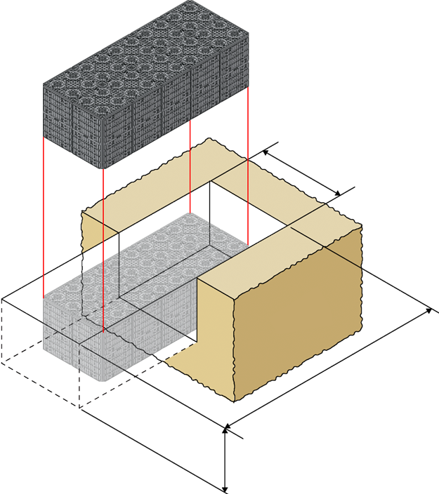 Para crear un agujero de excavación, complete el material de relleno requerido en el diagrama a continuación – incluye el pavimento y el terreno. ACO recomienda un mínimo de 0,5 m de cobertura total para aplicaciones de jardinería y un mínimo de 0,6 m para aplicaciones de tráfico de vehículos.